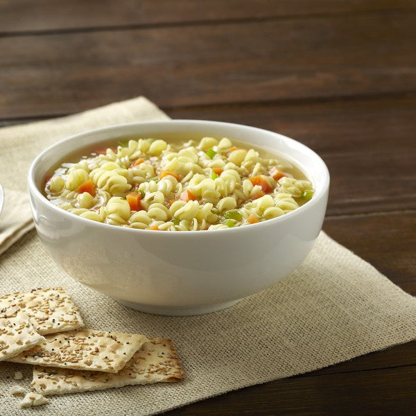 - 3 Pouches of Chicken Noodle Soup (12 Total Servings) Serving Size ¼ Pouch. 160 Calories Per Serving (Fat 0g, Carbs 33g, Fiber 1g, Protein 4g). Vegetarian. Allergens: Wheat.