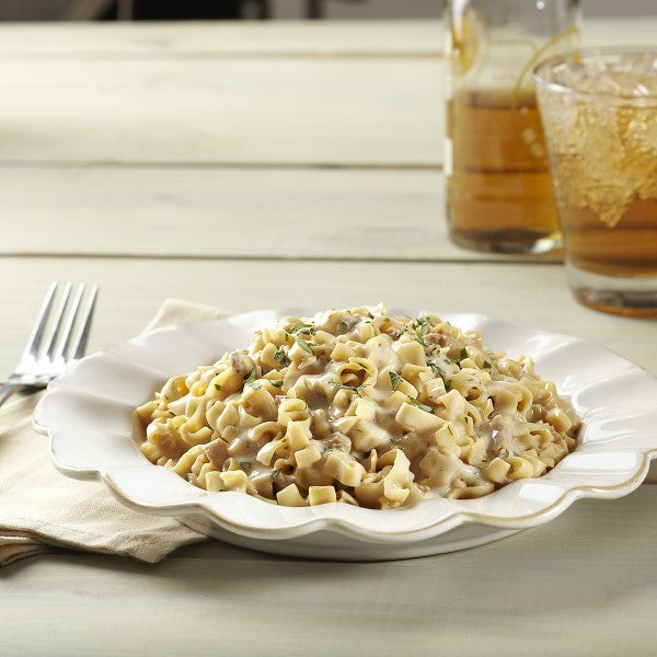 - 3 Pouches of Savory Stroganoff (12 Total Servings) Serving Size ¼ Pouch. 220 Calories Per Serving (Fat 3.5g, Carbs 39g, Fiber 1g, Protein 7g). Allergens: Milk, Wheat.