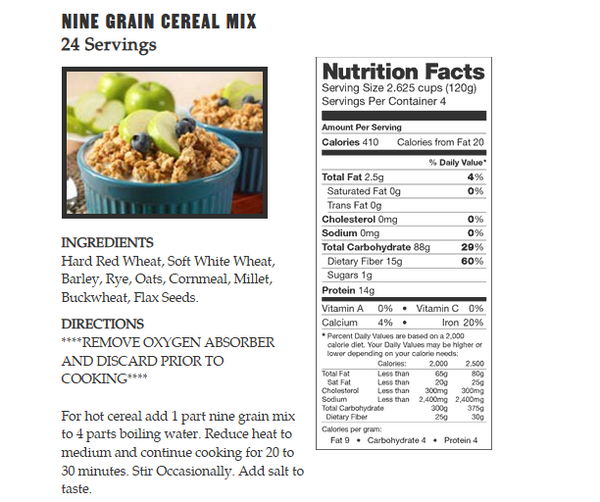 Nine Grain Cereal Mix (24 Servings) Serving Size 2.625 Cups, 410 Calories Per Serving, (Fat 2.5g, Carbs 88g, Fiber 15g, Protein 14g) Allergens: Wheat.