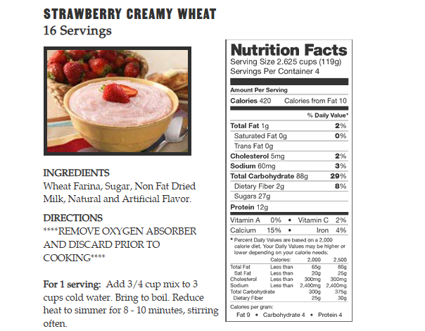 Strawberry Creamy Wheat (16 Servings) Serving Size 2.625 Cups, 420 Calories Per Serving, (Fat 1g, Carbs 88g, Fiber 2g, Protein 12g) Allergens: Wheat, Milk.