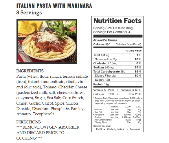 Italian Pasta with Marinara (8 Servings) Serving Size 1.5 Cups, 320 Calories Per Serving, (Fat 4g, Carbs 58g, Fiber 2g, Protein 12g) Allergens: Wheat, Milk.