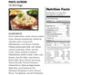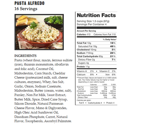 Pasta Alfredo (16 Servings) Serving Size 1.5 Cups, 410 Calories Per Serving, (Fat 12g, Carbs 63g, Fiber 2g, Protein 11g) Allergens: Wheat, Milk.