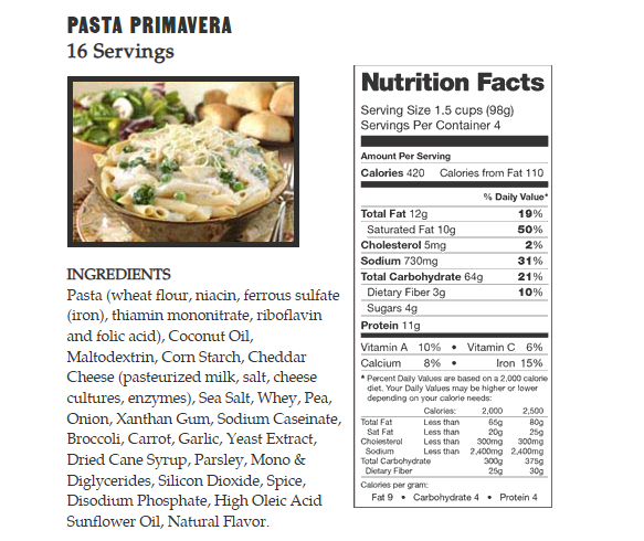 Pasta Primavera (16 Servings) Serving Size 1.5 Cups, 420 Calories Per Serving, (Fat 12g, Carbs 64g, Fiber 3g, Protein 11g) Allergens: Wheat, Milk.