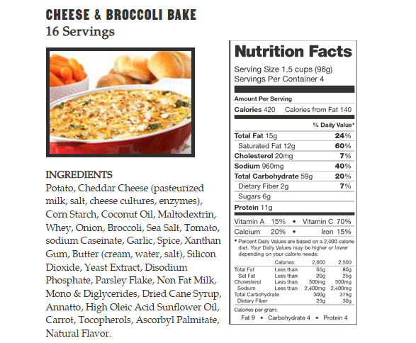 Cheese and Broccoli Bake (16 Servings) Serving Size 1.5 Cups, 420 Calories Per Serving, (Fat 15g, Carbs 59g, Fiber 2g, Protein 11g) Gluten Free. Allergens: Milk.