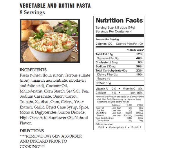 Vegetable Rotini Pasta (8 Servings) Serving Size 1.5 Cups, 400 Calories Per Serving, (Fat 11g, Carbs 65g, Fiber 2g, Protein 10g) Allergens: Wheat.