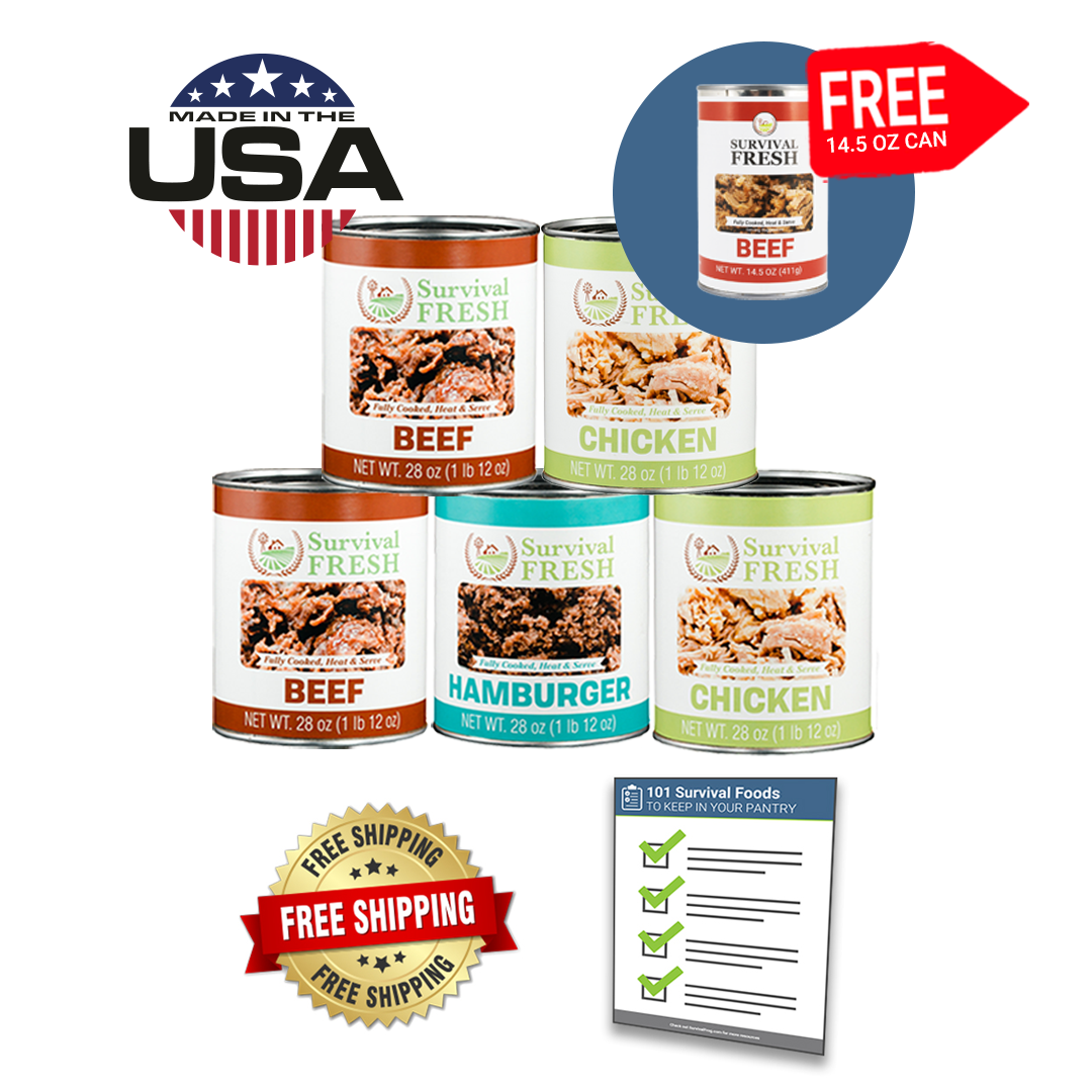 The Canned Meat Starter Pack includes 2X 28oz Chicken, 2X 28oz Beef, 1X 28 oz Hamburger Ground Beef, PLUS 1X bonus 14.5oz Can of Beef.